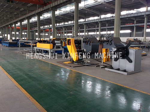 Layout: feeding trolley - uncoiler - expanded main machine - roll profiling machine - hydraulic rib lath shearing machine - hydraulic automatic rib lath collect - control cabinet.