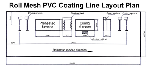 Description of auto continous powder coating line:This PVC Coating Line is used to provide an anti-corrosive surface treatment for steel wire roll mesh, wire mesh, mesh coil.