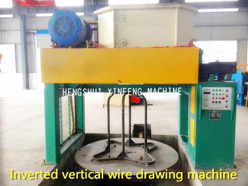 Vertical wire drawing machine contains machine frame, reducer, drum, recoiler, trolley, pneumatic system, AC frequency conversion electric control system and motor.
